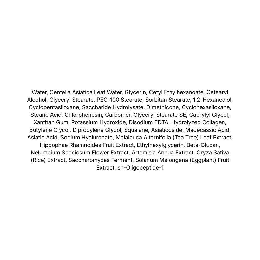 Centella Asiatica Leaf Water, Asiaticoside, Asiatic Acid, Madecassic Acid: un complex cunoscut pentru proprietățile calmante și reparatoare. Ajută la reducerea roșeții și a disconfortului, susținând refacerea barierei cutanate și protejând pielea sensibilă.