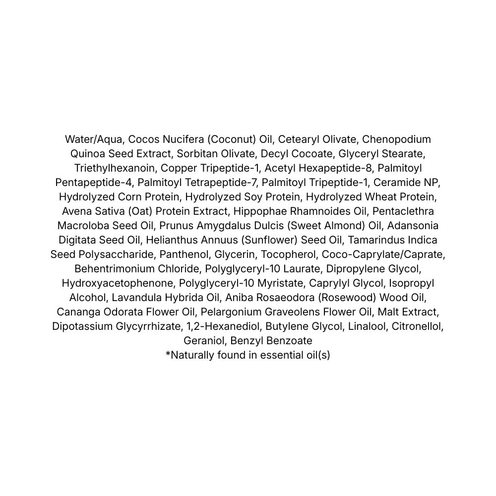 - Copper Tripeptide-1, Acetyl Hexapeptide-8, Palmitoyl Peptides (complex de peptide) – contribuie la repararea și netezirea părului deteriorat.
