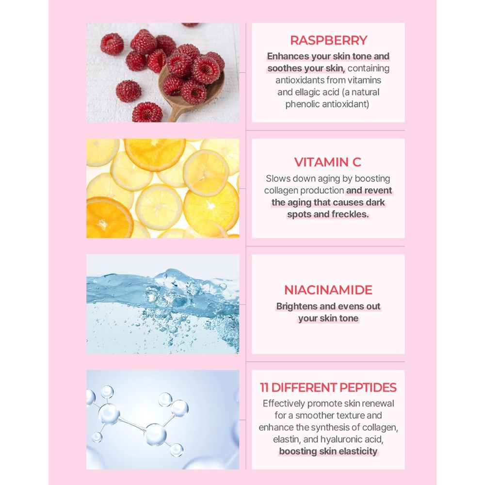 Be The Skin Vitavita Raspberry Ampoule este un ser concentrat cu efect iluminator, formulat pentru a susține uniformizarea nuanței pielii și pentru a îmbunătăți vizibil textura tenului. Formula combină ingrediente active recunoscute pentru proprietățile lor antioxidante și revitalizante. Textura este lejeră, se absoarbe rapid și oferă hidratare fără senzație lipicioasă.