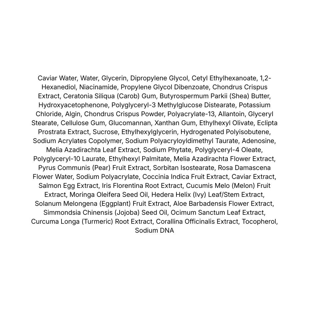 Apă de caviar și extract de caviar – ingrediente cu rol de revitalizare la suprafața pielii, contribuind la un aspect neted, suplu și sănătos.