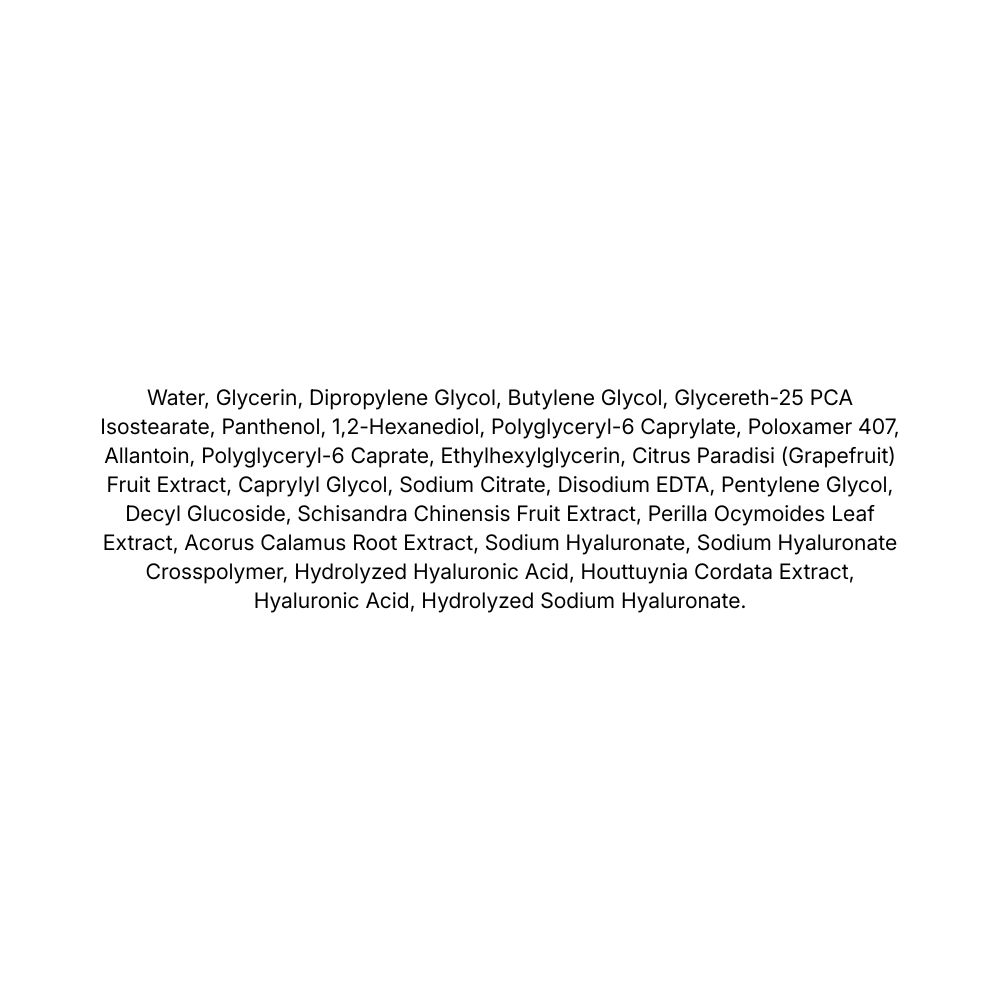 Sodium Hyaluronate, Sodium Hyaluronate Crosspolymer, Hydrolyzed Hyaluronic Acid, Hydrolyzed Sodium Hyaluronate, Hyaluronic Acid – cinci forme de acid hialuronic cu greutăți moleculare diferite care ajută la hidratarea pielii în profunzime și la menținerea elasticității.