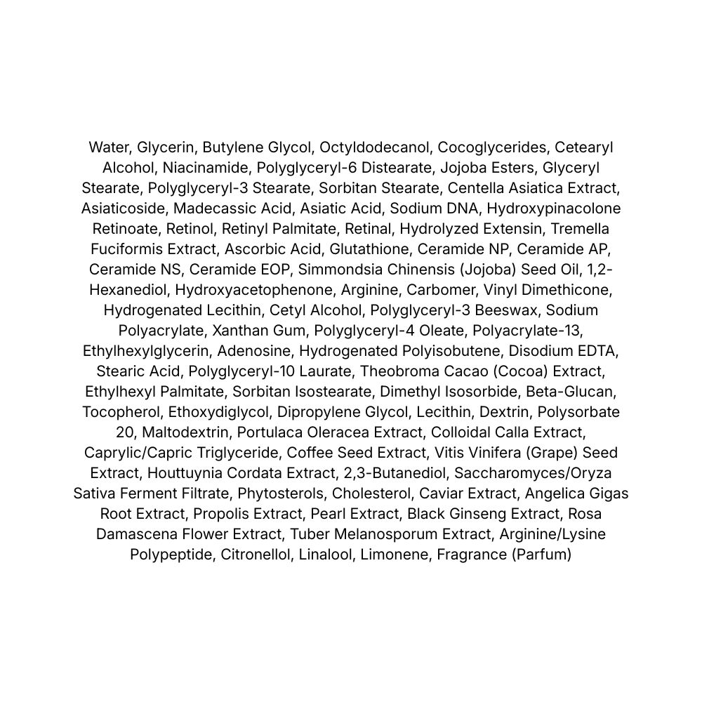 - Hydroxypinacolone Retinoate, Retinol, Retinal, Retinyl Palmitate – sistem complex de retinol ce acționează pe mai multe niveluri pentru reducerea ridurilor și uniformizarea texturii.