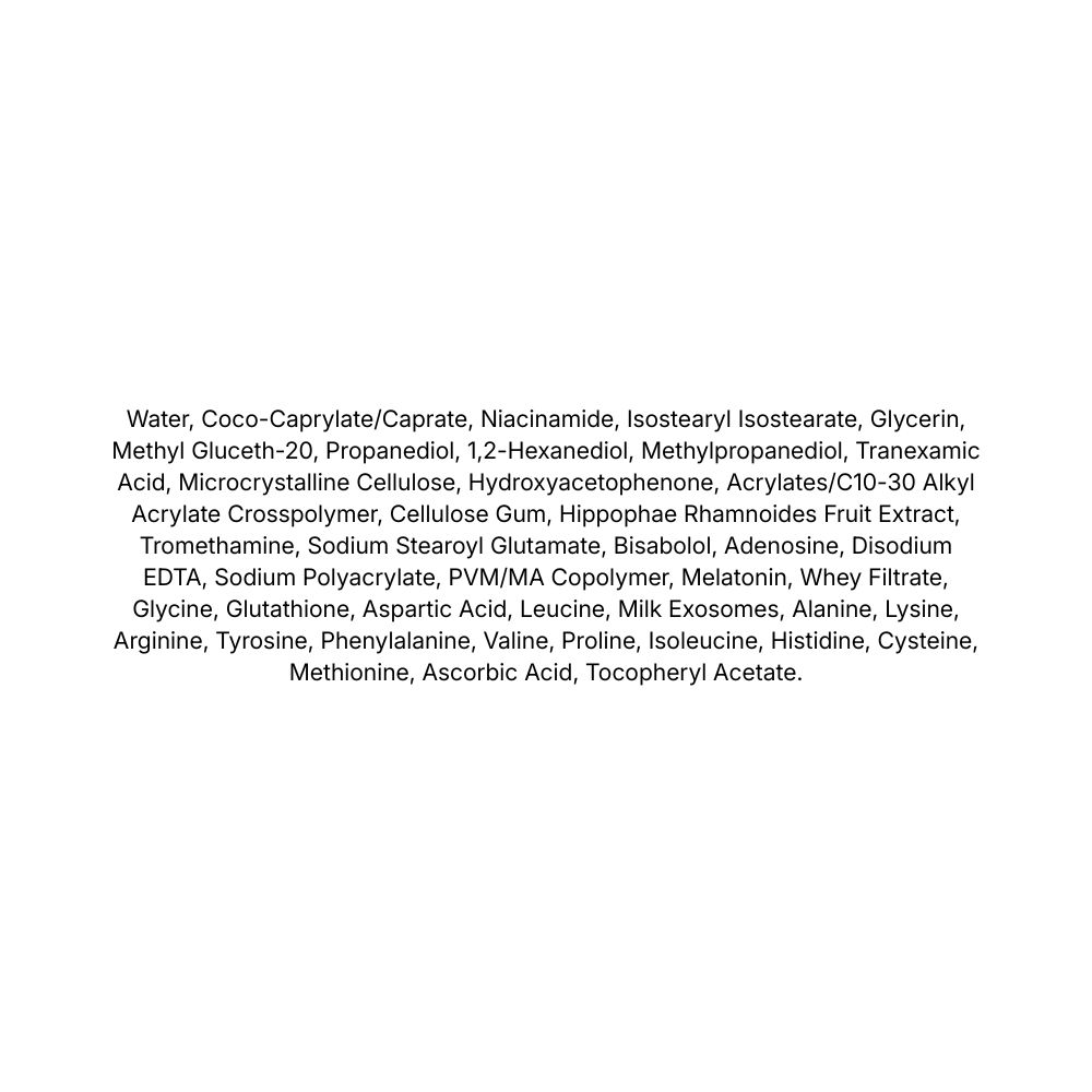 Datorită combinației de glutation, acid tranexamic și vitamina C, produsul acționează asupra factorilor care contribuie la aspectul neuniform al pielii. În plus, melatonina și exozomii din lapte completează complexul antioxidant, susținând protecția pielii împotriva stresului oxidativ.