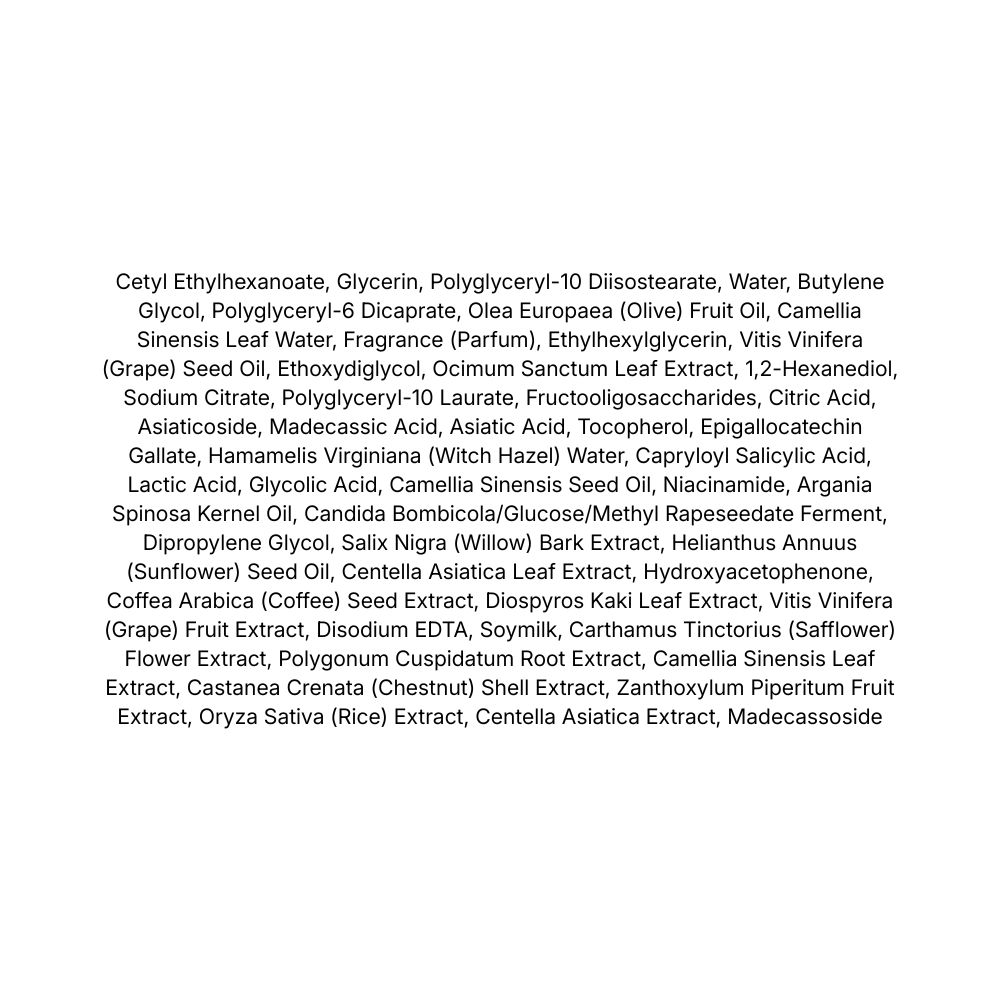 • Extract de Centella Asiatica, Asiaticoside, Madecassic Acid, Asiatic Acid, Madecassoside – calmează iritațiile, susțin regenerarea pielii și întăresc bariera cutanată.