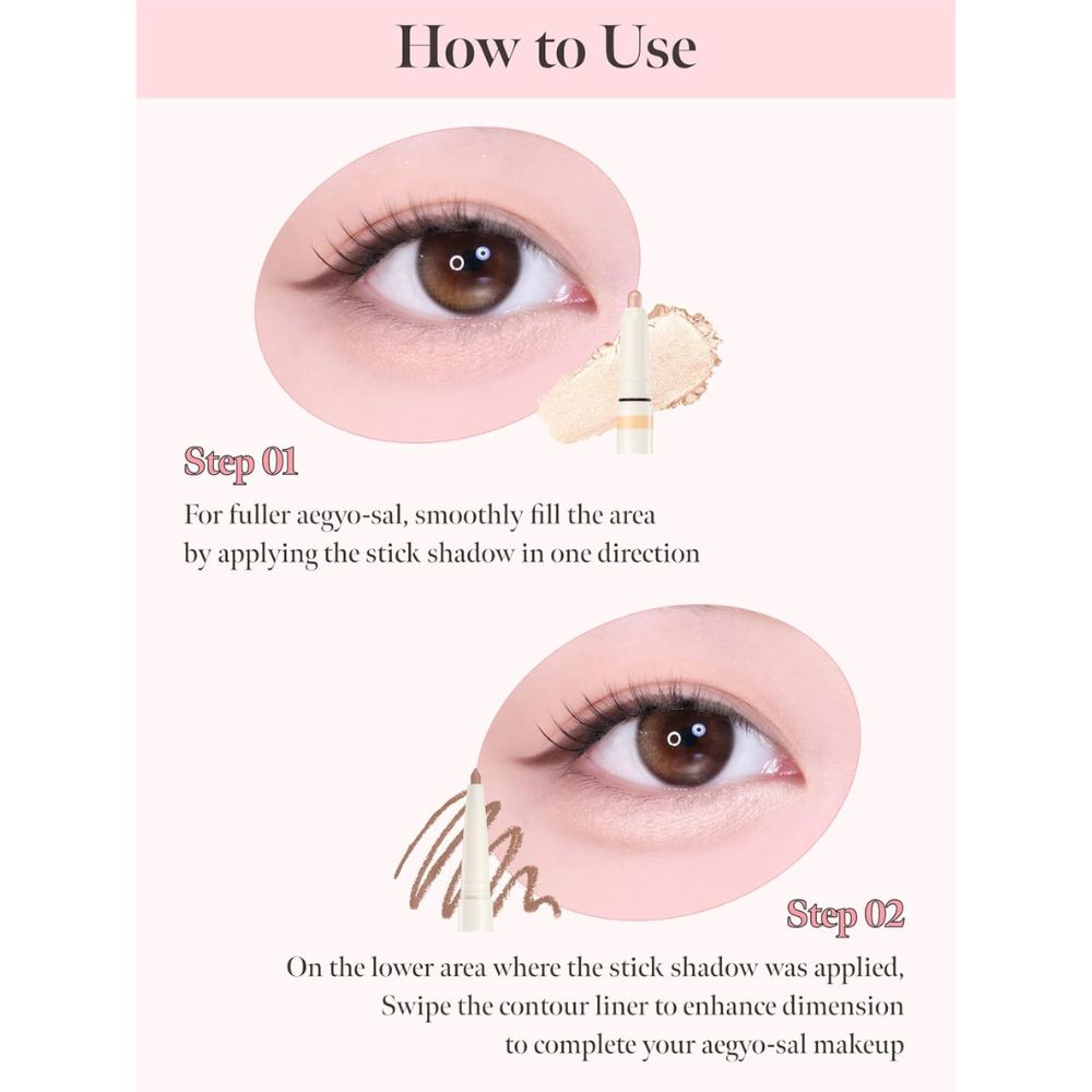 Coralhaze Dual Aegyosal Maker este un produs 2-în-1 creat pentru a defini și ilumina zona de sub ochi, oferind instant un efect natural de volum și un aspect odihnit. Formatul dual combină un stick iluminator cu textură fină și un creion de contur ușor de controlat, astfel încât accentuarea aegyosal-ului devine rapidă, intuitivă și potrivită pentru machiajul de zi cu zi.