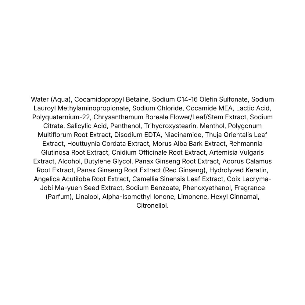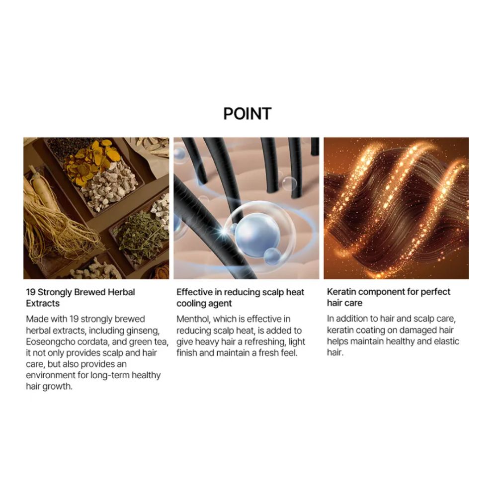 Extracte din plante medicinale coreene (crizantemă, angelica, ceai verde, rehmannia, polygonum multiflorum etc.) – oferă un complex nutritiv ce întărește fibra capilară și ajută la prevenirea fragilității.