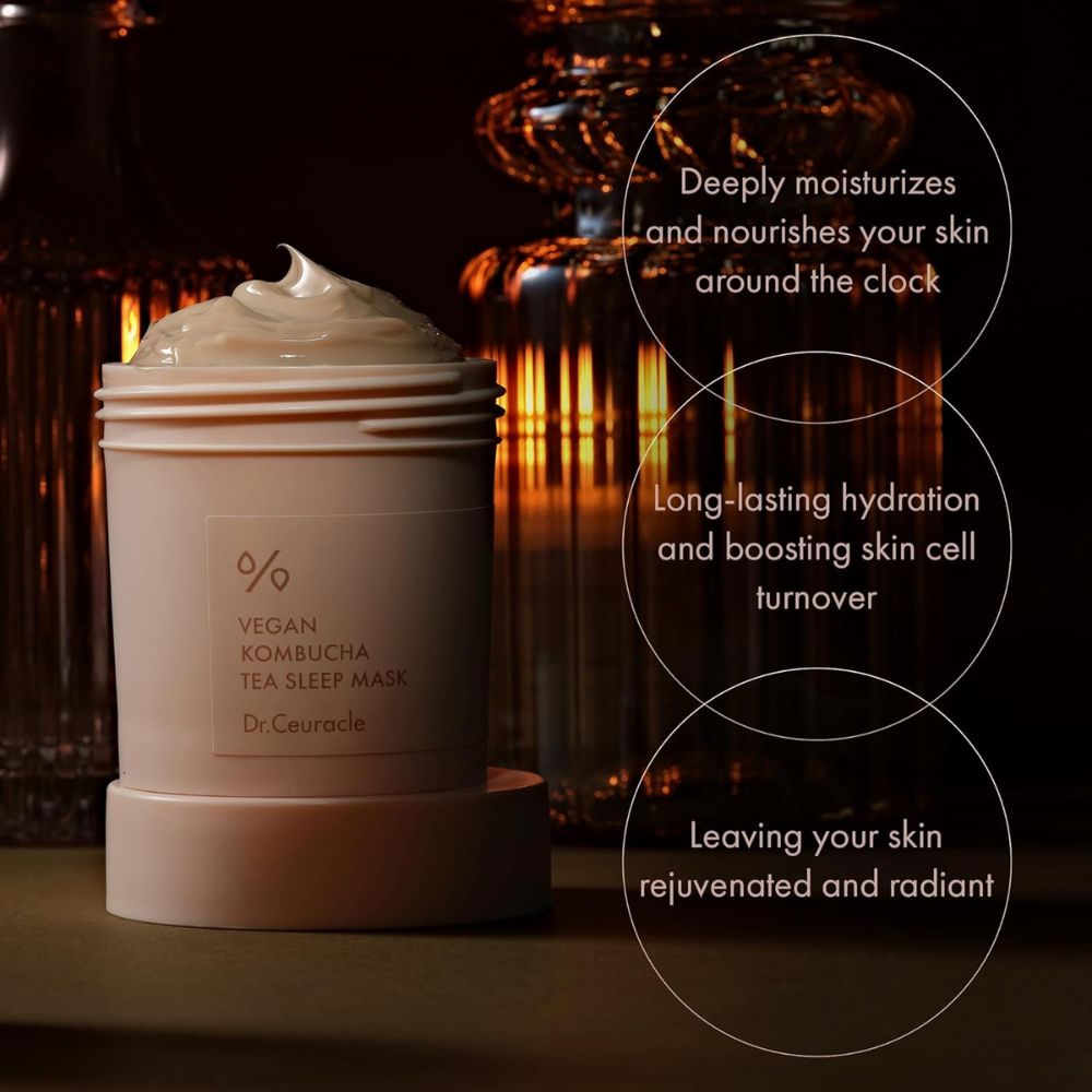 Dr. Ceuracle Vegan Kombucha Tea Sleep Mask este o mască de noapte cu formulă vegană, creată pentru a hrăni pielea în timpul somnului și pentru a-i reda un aspect neted și plin dimineața. Textura sa bogată, dar echilibrată, se aplică ușor și se absoarbe treptat, susținând procesele naturale de regenerare ale pielii pe parcursul nopții. Formula este concepută pentru a oferi confort pielii, fără a crea senzație de greutate sau disconfort, fiind potrivită pentru utilizare regulată.