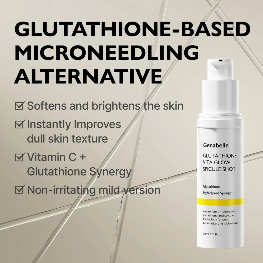 Genabelle Glutathione Vita Glow Spicule Shot este o un produs iluminator de ultimă generație, inspirat de tehnicile profesionale de microneedling. Acesta utilizează spicule marine pentru a susține micro-infuzia ingredientelor active și pentru a amplifica eficiența acestora, fără perioadă de recuperare. Textura lejeră se aplică ușor și este concepută pentru a îmbunătăți vizibil aspectul tonului pielii, al texturii și al luminozității generale.