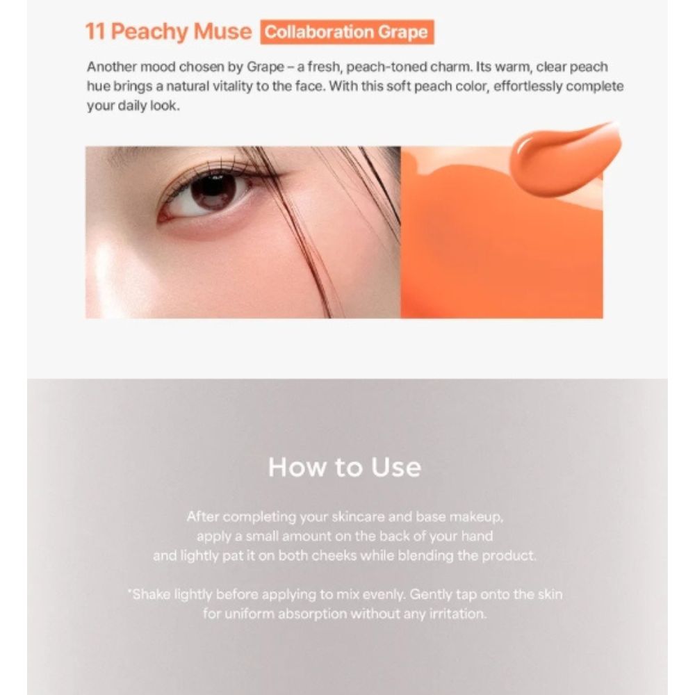 După aplicarea produselor de îngrijire și a machiajului de bază, agită ușor flaconul. Aplică o cantitate mică pe dosul mâinii. Tapotează delicat produsul pe obraji și estompează ușor cu degetele sau cu un burețel, până la obținerea unui aspect uniform și natural. Aplicarea graduală permite controlul intensității culorii, fără a irita pielea.