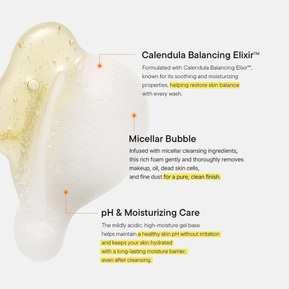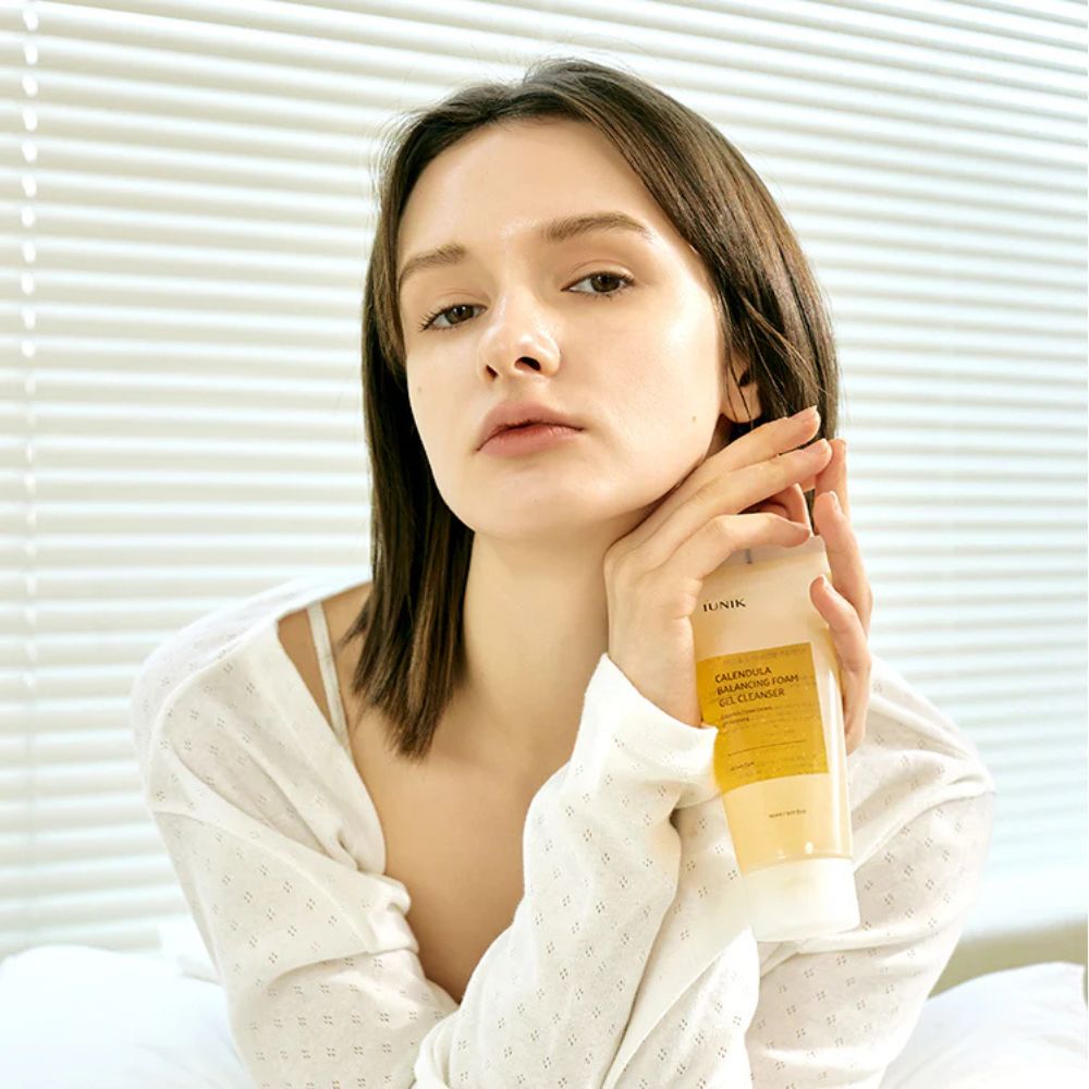 Iunik Calendula Balancing Foam Gel Cleanser este un gel de curățare conceput pentru a îndepărta eficient impuritățile zilnice, sebumul, protecția solară și machiajul ușor, fără să usuce sau să irite pielea. Formula combină tehnologia micelară de purificare cu o microspumă fină tip air-cushion, care curăță delicat și lasă pielea confortabilă. pH-ul scăzut și complexul cu calendula susțin echilibrul pielii și contribuie la menținerea unei bariere cutanate sănătoase.