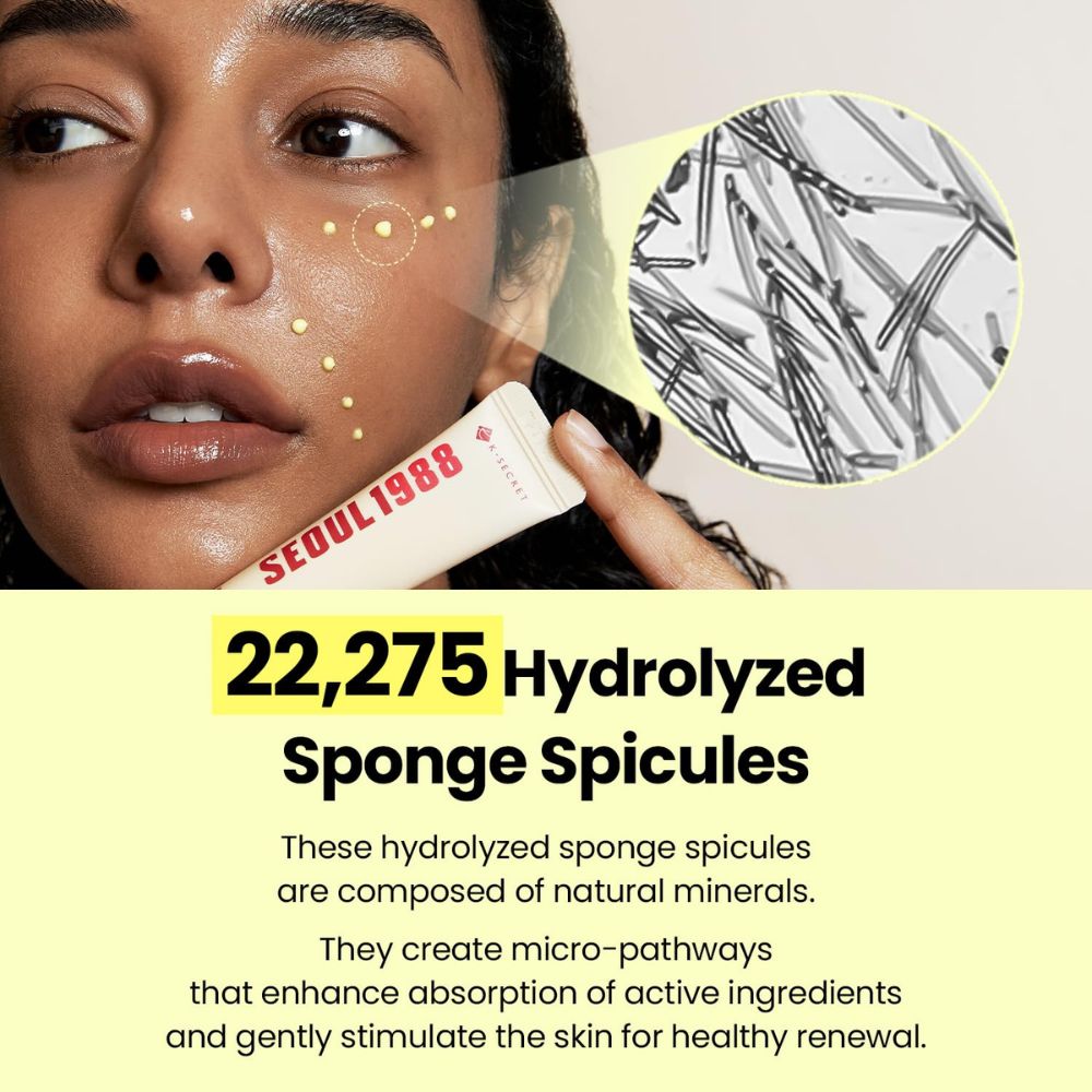 - Hydrolyzed Sponge (spicule) – susține exfolierea delicată, stimulează producția de colagen pentru o piele mai fermă și favorizează absorbția ingredientelor active în piele.