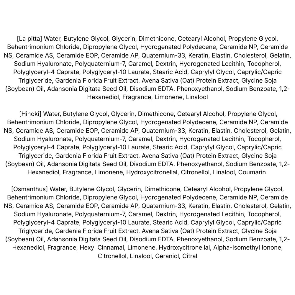 Osmanthus – destinată părului gros sau deteriorat. Hrănește intens, repară firele despicate și adaugă un miros fructat-floral senzual, cu note de osmanthus, trandafir, iris și lemn de santal.