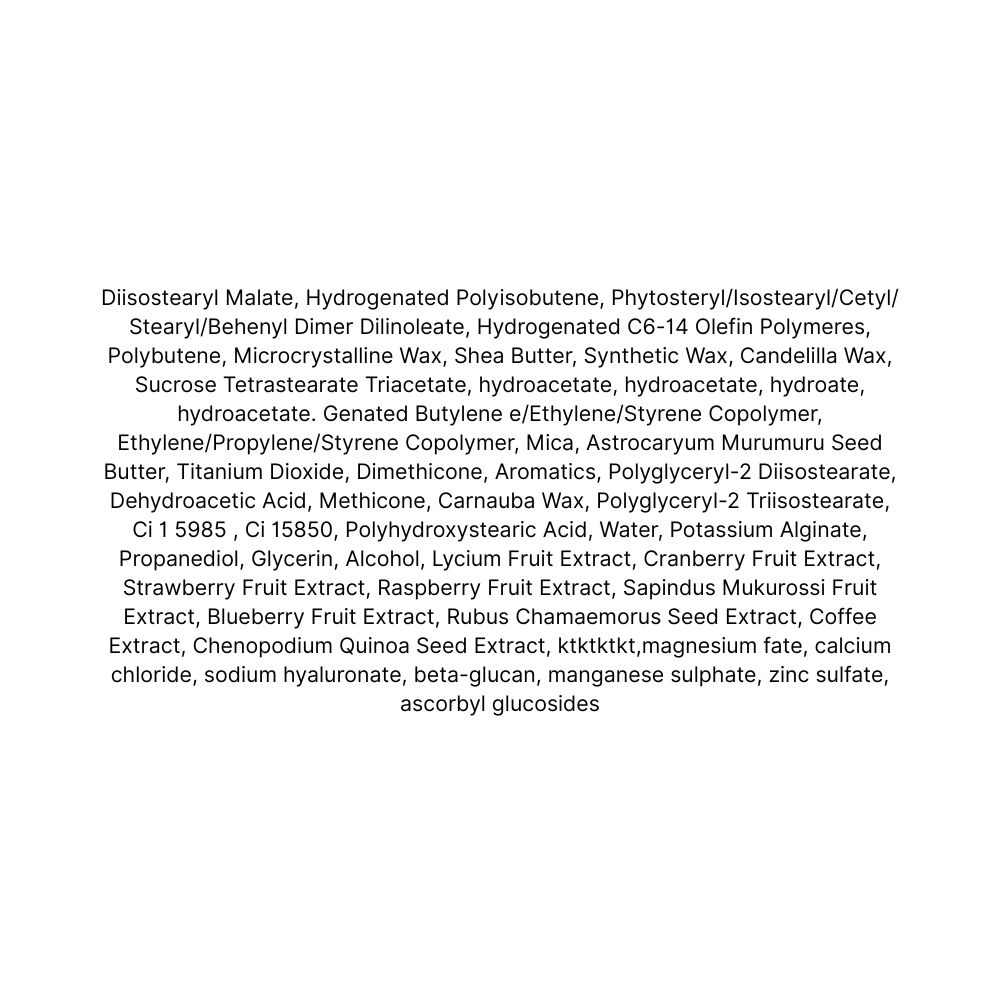 Extractele din fructe de pădure (căpșuni, zmeură, coacăze și merișor) adaugă un plus de antioxidanți naturali, oferind buzelor un aspect luminos și sănătos.