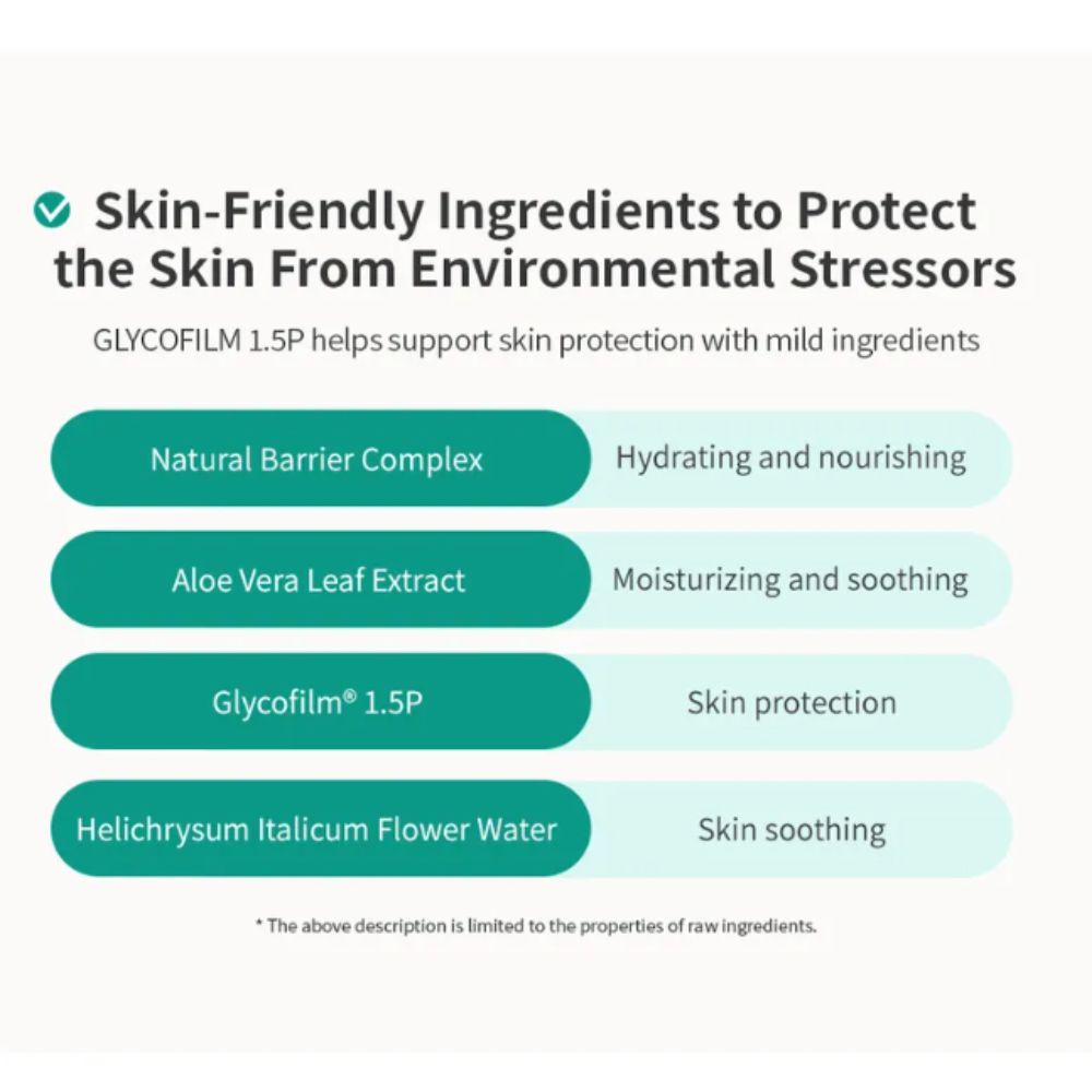 Include ingredientul Glycofilm 1.5P, care formează o peliculă protectoare împotriva poluării și factorilor externi nocivi.