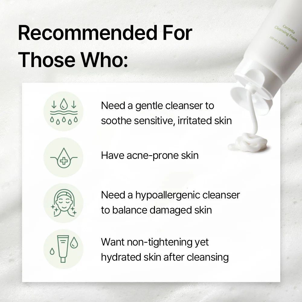 MIXSOON Centella Cleansing Foam este o spumă de curățare delicată, creată pentru a îndepărta eficient impuritățile, excesul de sebum și urmele de machiaj, fără a afecta bariera naturală a pielii. Formula reînnoită conține 32,8% extract de Centella Asiatica, cunoscut pentru proprietățile sale calmante, și are un pH ușor acid (4–5), care susține echilibrul natural al tenului. Textura lejeră se transformă într-o spumă bogată și fină, oferind o senzație de prospețime imediată. Este o alegere potrivită pentru utilizarea zilnică și pentru toate tipurile de ten, inclusiv pentru pielea sensibilă.
