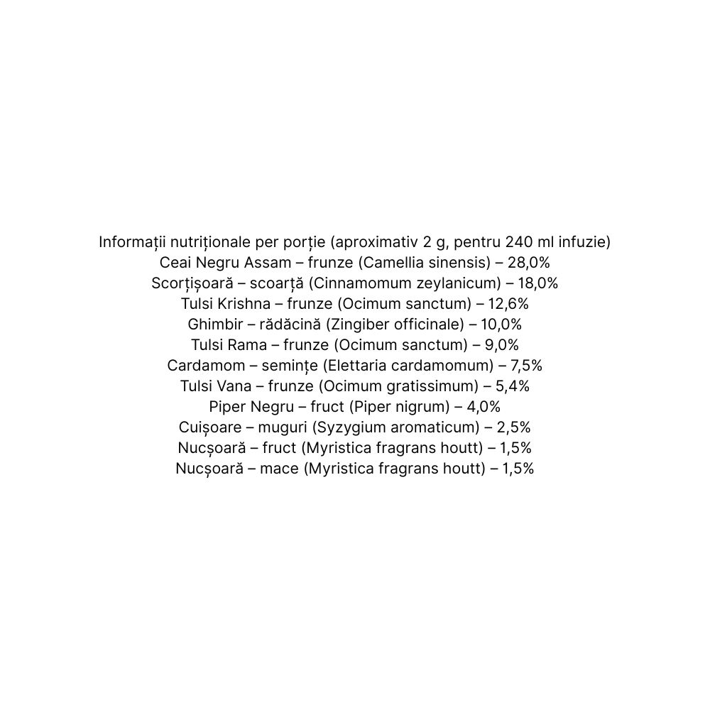 Acest ceai este 100% certificat organic și nu conține organisme modificate genetic. Procesul de cultivare nu implică pesticide, erbicide sau fertilizatori sintetici. Prin combinația de ceai negru de calitate superioară, condimente tradiționale și frunzele de Tulsi, infuzia devine o experiență completă – revigorantă, aromată și sănătoasă.