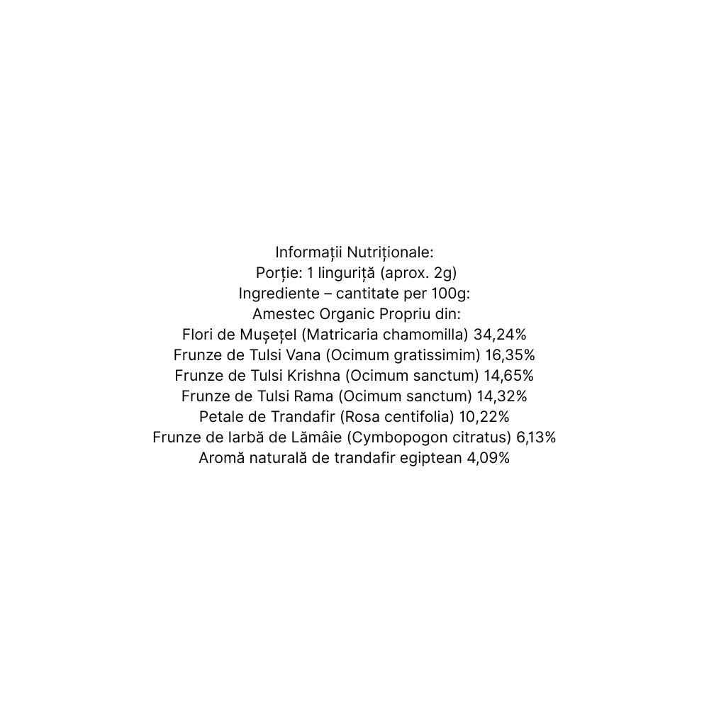 Acest ceai antistres și energizant natural este certificat 100% organic, fără organisme modificate genetic. În procesul de producție nu se utilizează pesticide, îngrășăminte chimice sau tratamente sintetice. Amestecul aduce împreună aroma liniștitoare a mușețelului, dulceața petalelor de trandafir și esența naturală de trandafir egiptean, evocând exotismul Indiei.
