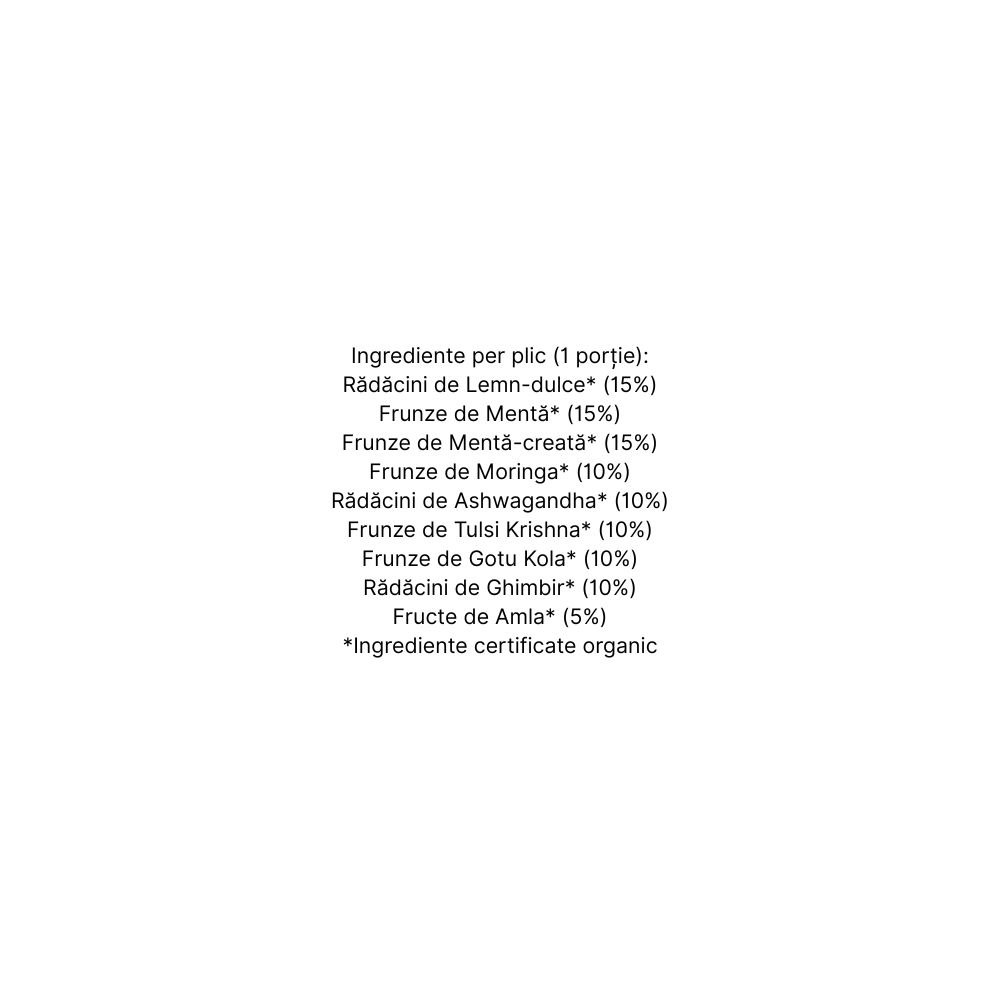 Acest ceai adaptogen energizant este realizat exclusiv din plante certificate organic. Nu conține pesticide, erbicide sau organisme modificate genetic.