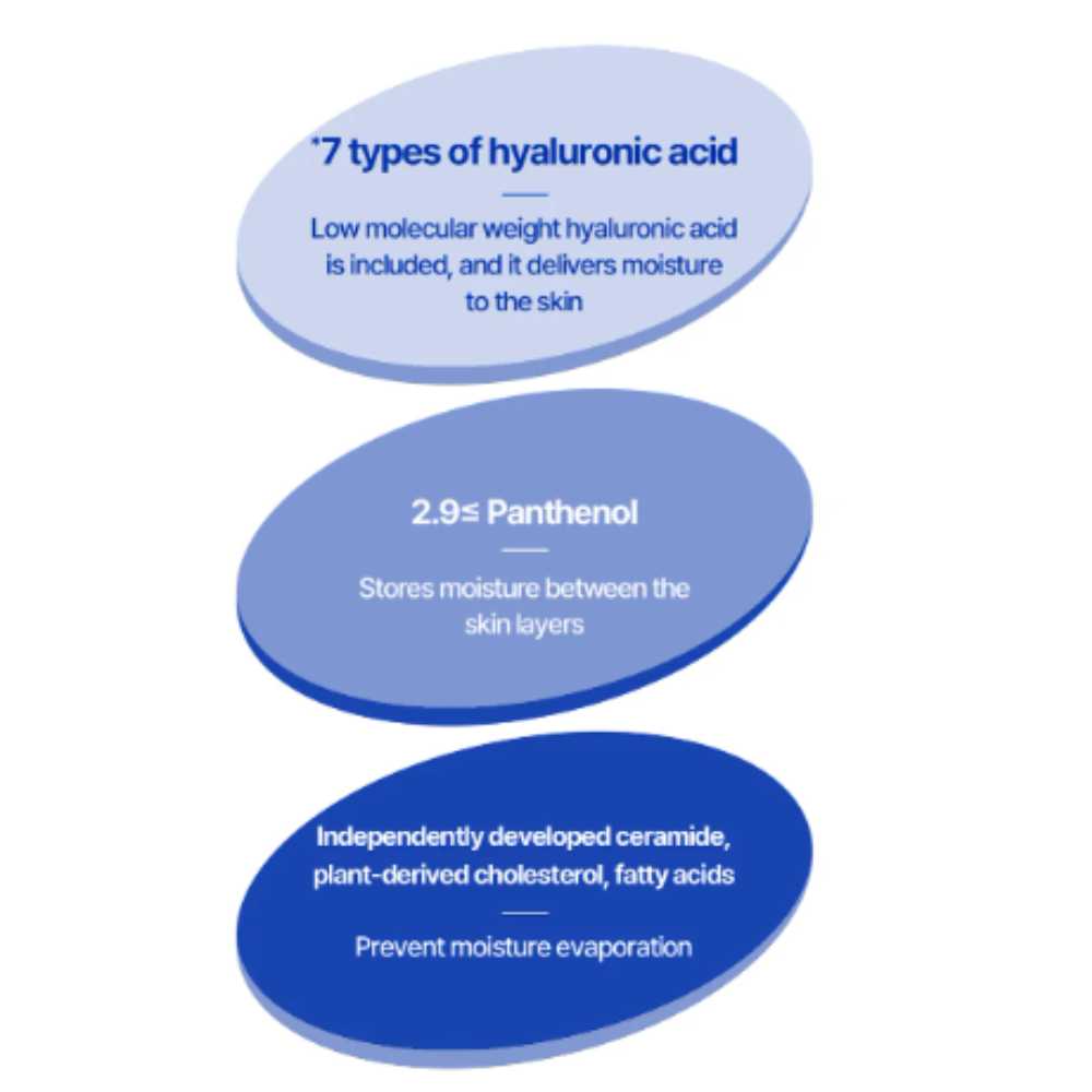 Complex cu 7 tipuri de acid hialuronic – include forme cu greutate moleculară diferită, care ajută la hidratarea straturilor multiple ale pielii și la menținerea apei în piele