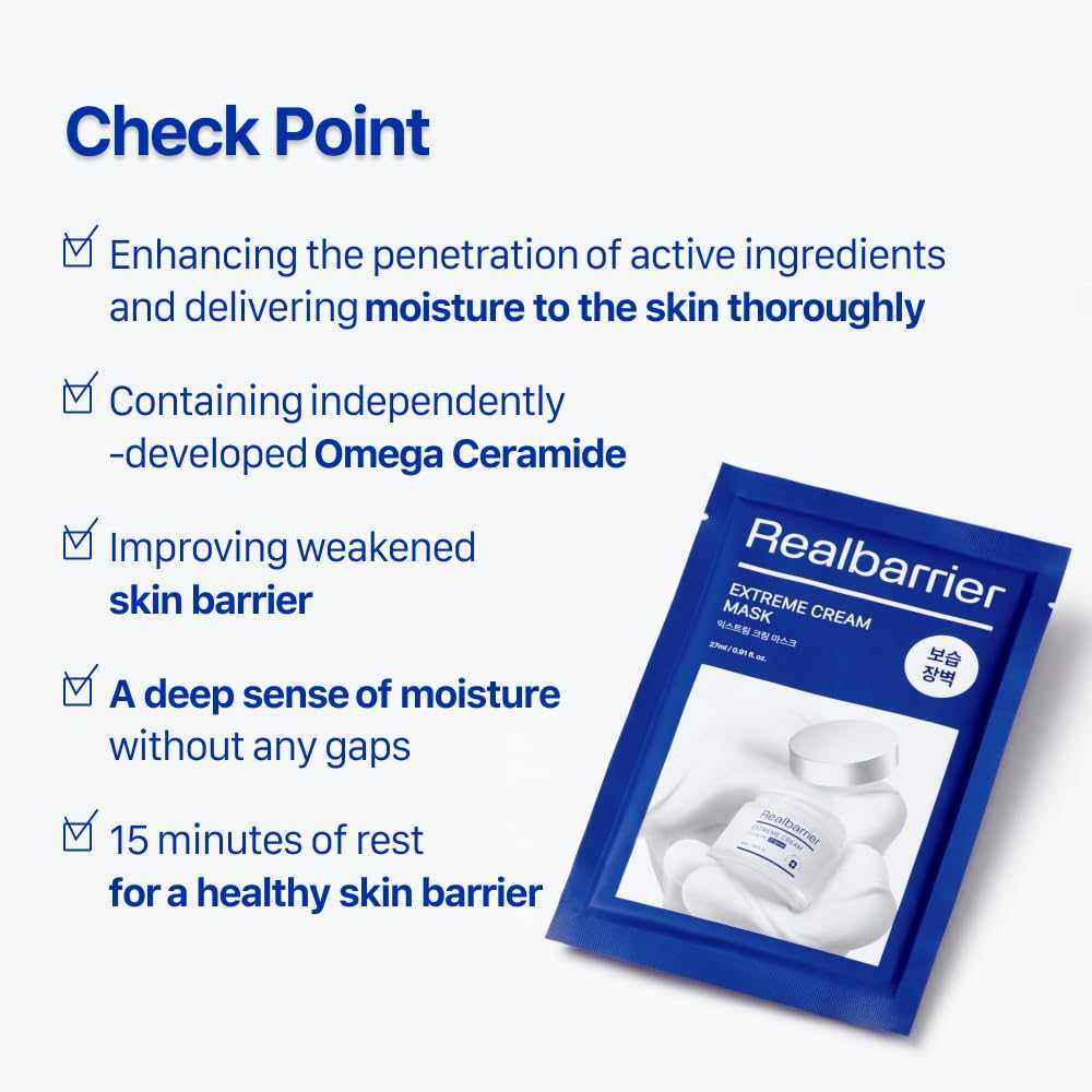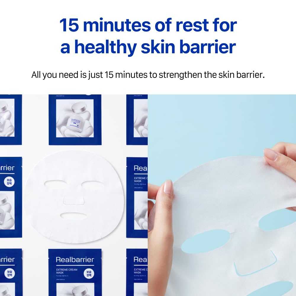 Real Barrier Extreme Cream Mask este o mască facială tip șervețel, îmbibată într-o formulă cremoasă, bogată în nutrienți, concepută pentru a reface confortul pielii și a susține bariera cutanată. Masca este destinată pielii uscate, sensibile sau afectate de factori externi, oferind îngrijire intensivă într-un timp scurt. Textura sa cremoasă aderă bine pe piele și permite absorbția eficientă a ingredientelor active.