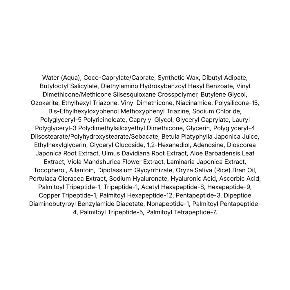 Filtre UV organice: Diethylamino Hydroxybenzoyl Hexyl Benzoate, Ethylhexyl Triazone, Bis-Ethylhexyloxyphenol Methoxyphenyl Triazine, Polysilicone-15 – asigură protecția față de radiațiile UV, contribuind la nivelul SPF 50+.