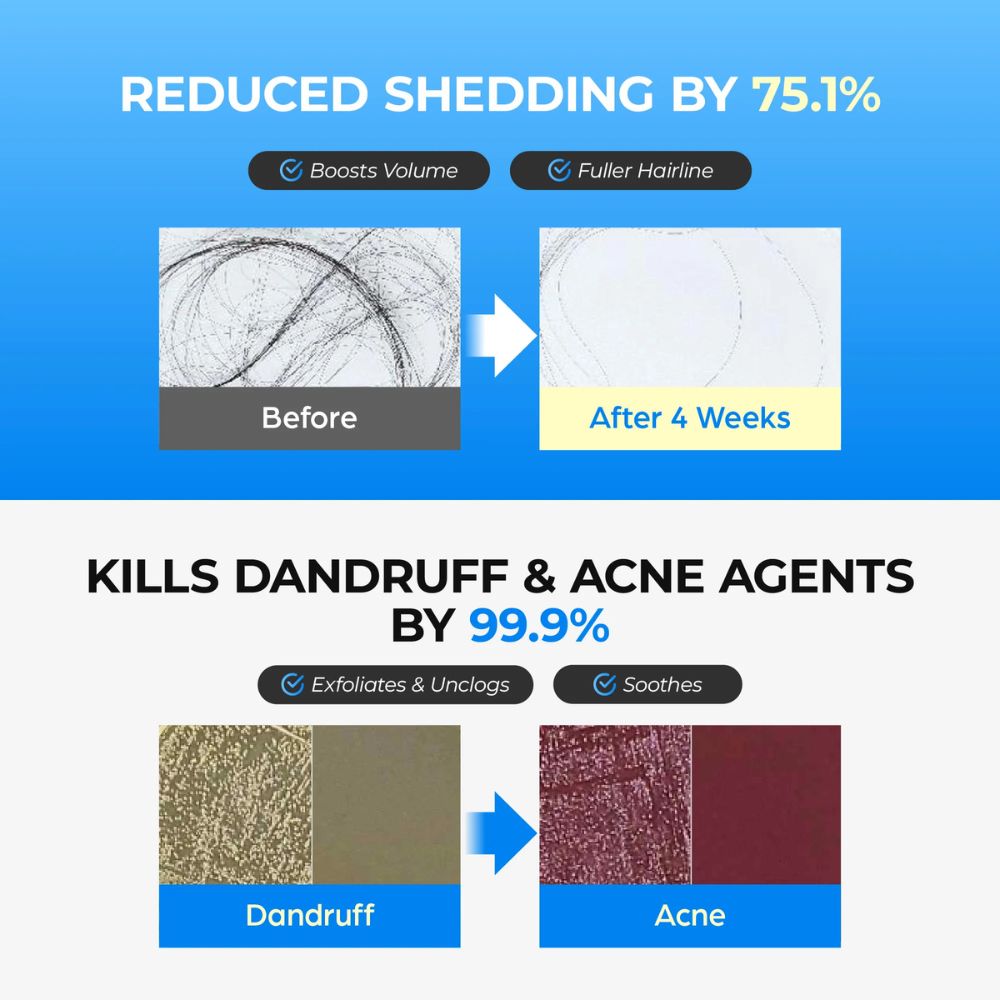 Oferă o exfoliere eficientă, îndepărtând celulele moarte și acumulările care împiedică creșterea normală a părului.