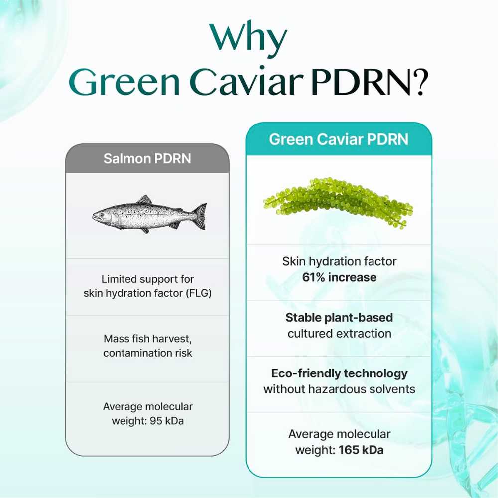 Produsul conține 100.000 ppm de PDRN vegetal premium din Green Caviar. Acest ingredient este obținut din alge marine cunoscute sub numele de „Green Caviar”. Este bogat în fucoidan și alginat, compuși care ajută la menținerea hidratării pielii. Aceștia susțin procesele naturale de refacere și întărire a barierei cutanate.