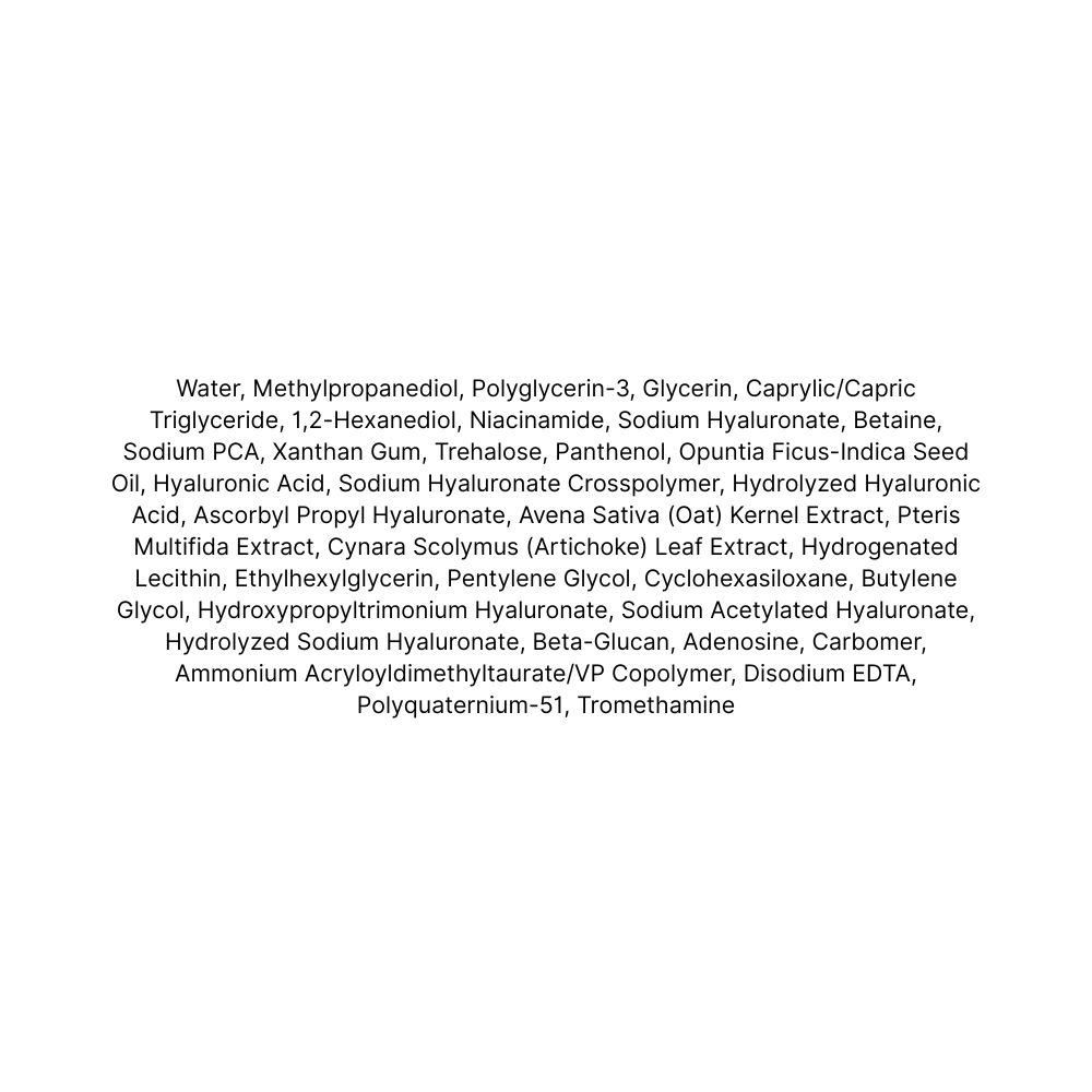Acid hialuronic (8 tipuri) – hidratează strat cu strat, de la suprafață până în profunzime, reținând până la 1000 de ori greutatea sa în apă. Moleculele mari mențin hidratarea la suprafață, iar cele mici pătrund adânc pentru o piele vizibil mai plină.