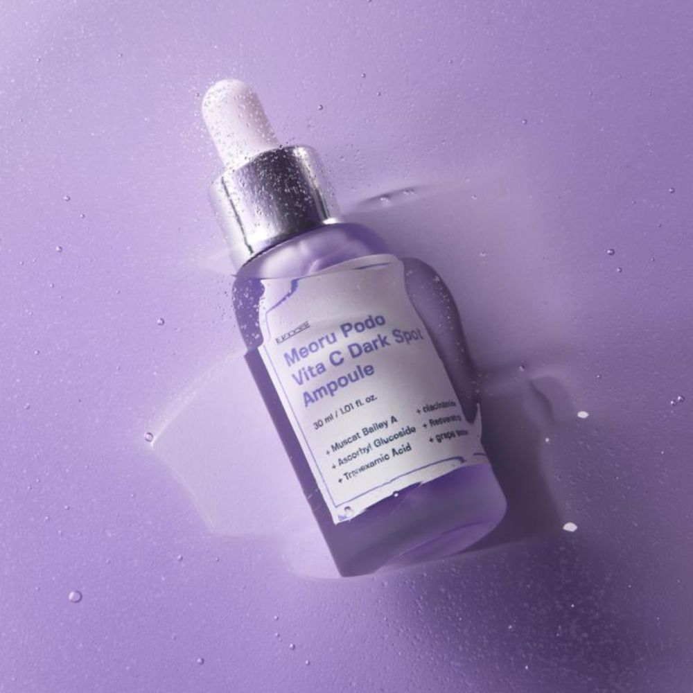 Sungboon Editor Meoru Podo VitaC Dark Spot Ampoule este un ser iluminator formulat pentru a reduce vizibil petele pigmentare și imperfecțiunile. Formula conține extract de struguri și derivați de vitamina C, care ajută la uniformizarea nuanței pielii. Niacinamida contribuie la diminuarea producției de melanină. Textura ușoară se absoarbe rapid și oferă hidratare intensă, datorită complexului de acid hialuronic. Extractele calmante susțin confortul pielii, fără senzație de iritare. Culoarea naturală ușor mov provine din conținutul ridicat de struguri.
