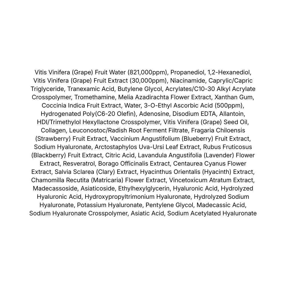 - Vitis Vinifera (Grape) Fruit Water (821,000ppm), Vitis Vinifera (Grape) Fruit Extract (30,000ppm) – bogate în antioxidanți, susțin protecția pielii și oferă efect iluminator.