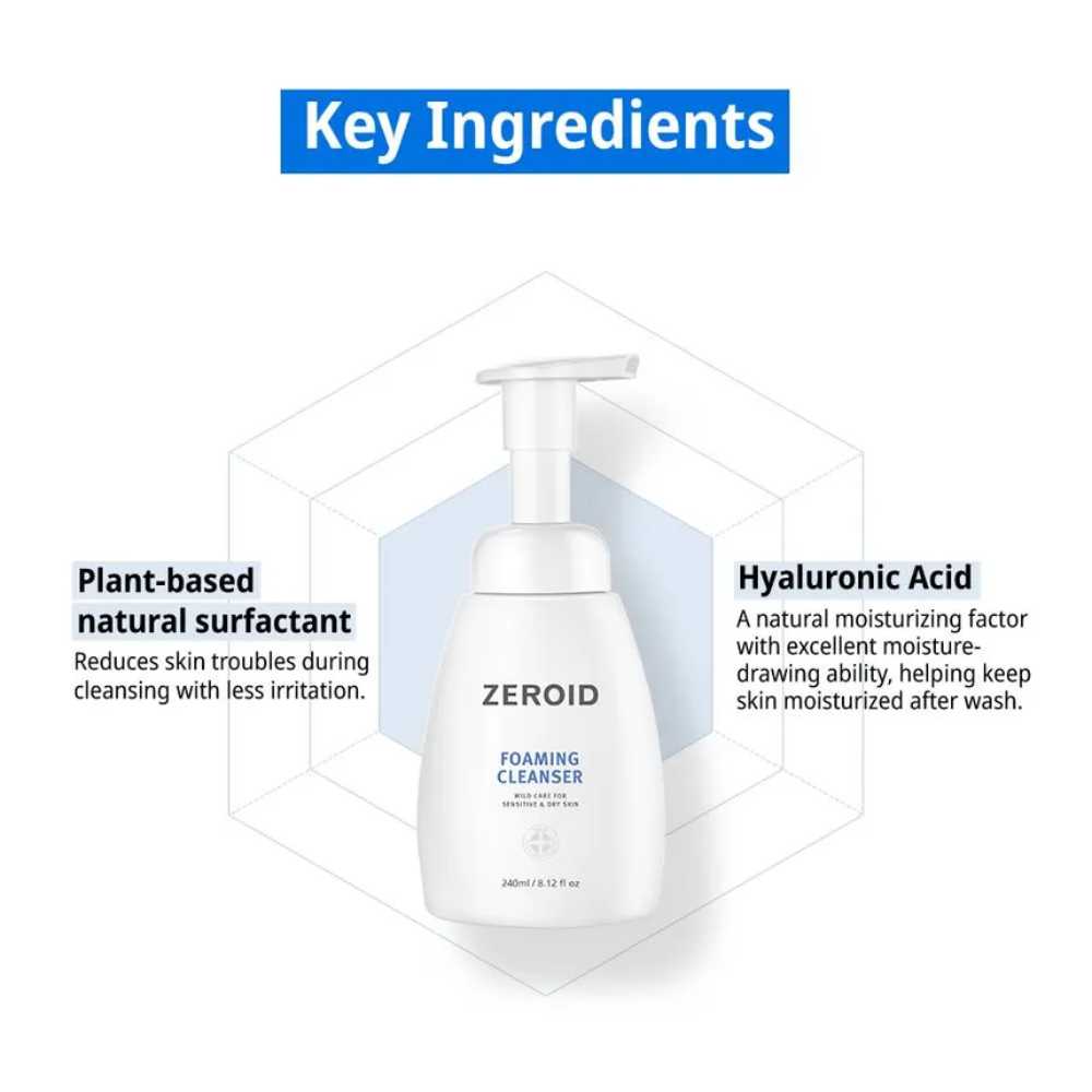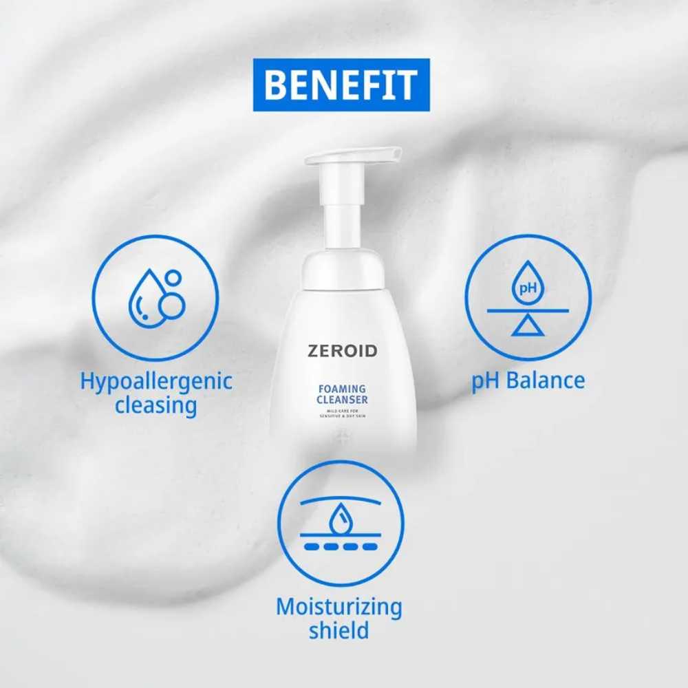 Zeroid Foaming Cleanser este un produs de curățare blând, creat pentru a îndepărta eficient impuritățile și excesul de sebum, fără a compromite confortul pielii sensibile. Formula sa echilibrată ajută la menținerea hidratării naturale și oferă o senzație de prospețime după fiecare utilizare. Textura spumantă permite o aplicare uniformă, iar curățarea se realizează fără senzație de piele care „strânge”. Produsul este conceput pentru utilizare zilnică, atât pe față, cât și pe corp, fiind potrivit pentru persoanele care caută o curățare eficientă, dar delicată.